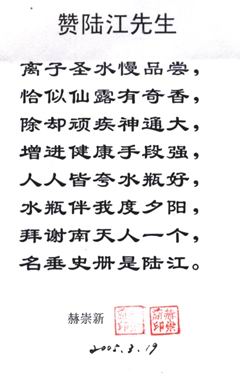 凡尊重中國(guó)古代養(yǎng)生智慧的患者,堅(jiān)持“已饑方食”和定時(shí)主動(dòng)補(bǔ)水者,均可祛病康復(fù)。如牡丹江醫(yī)學(xué)院87歲的張鵬圖飲用半年后高血壓未痊愈,陸江與他通話交流,了解他原先每日主食4兩,建議他用“已饑方食”減少主食肉食量,他理解后,將每日主食減為3兩,少吃兩塊肉,飲用一年治愈26年的冠心病和高血壓。他2003年5月31日來(lái)信說(shuō):“飲用卓康小分子團(tuán)水是根治高血壓、冠心病、糖尿病的一把金鑰匙,是填補(bǔ)醫(yī)學(xué)空白,為人類(lèi)造福,應(yīng)推廣該產(chǎn)品?!?/strong>